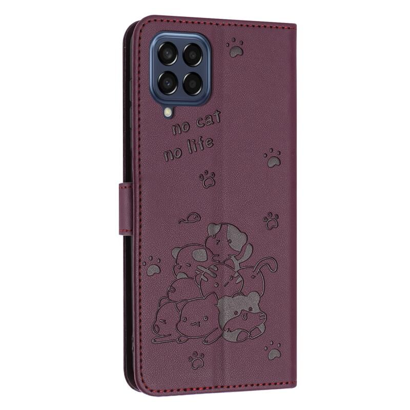Θήκη δερμάτινη για Samsung Galaxy M53 5G με ανάγλυφο γατάκι και κορδόνι (Μωβ)