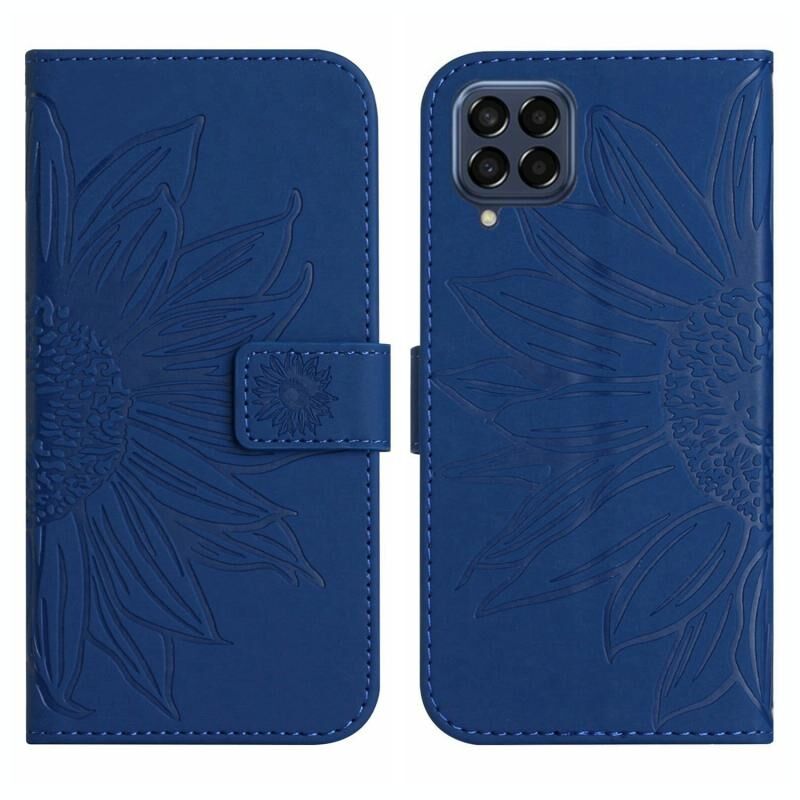 Για το Samsung Galaxy M53 5G δέρμα αίσθηση Sun Flower μοτίβο Flip δέρμα τηλέφωνο υπόθεση με κορδόνι (Σκούρο μπλε)