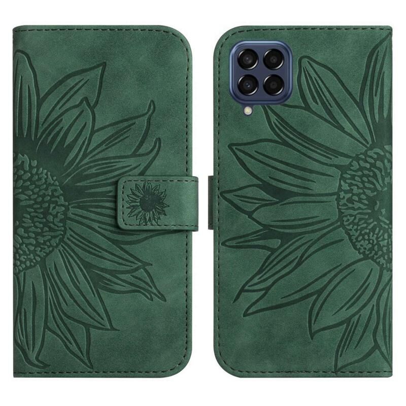 Για το Samsung Galaxy M53 5G δέρμα αίσθηση Sun Flower μοτίβο Flip δέρμα τηλέφωνο υπόθεση με κορδόνι (πράσινο)