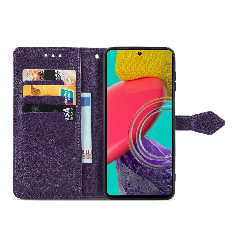Για Samsung Galaxy M53 Mandala λουλούδι ανάγλυφο οριζόντια Flip υπόθεση τηλεφώνου δέρμα (μωβ)