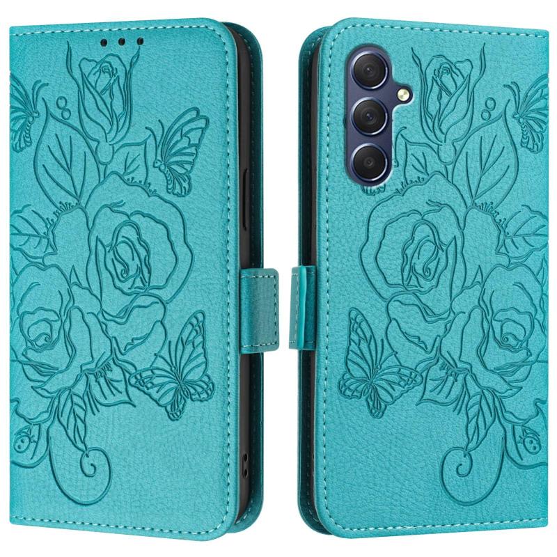 For Samsung Galaxy M54 5G Global / F54 5G Embossed Rose RFID Anti-theft Leather Phone Case(Light Blue)