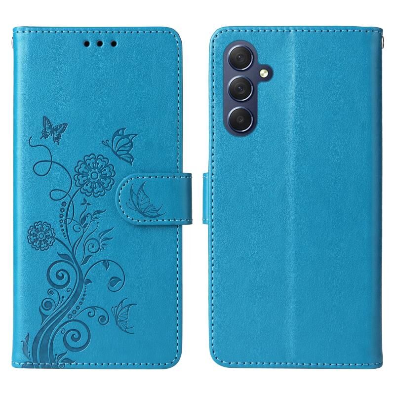 Θήκη τηλεφώνου δερμάτινη με ανάγλυφα σχέδια πεταλούδας και λουλουδιών για Samsung Galaxy M55 5G / C55 5G (Μπλε)
