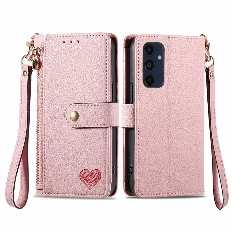 Για Samsung Galaxy M55 αγάπη φερμουάρ Lanyard δερμάτινη θήκη τηλεφώνου (ροζ)