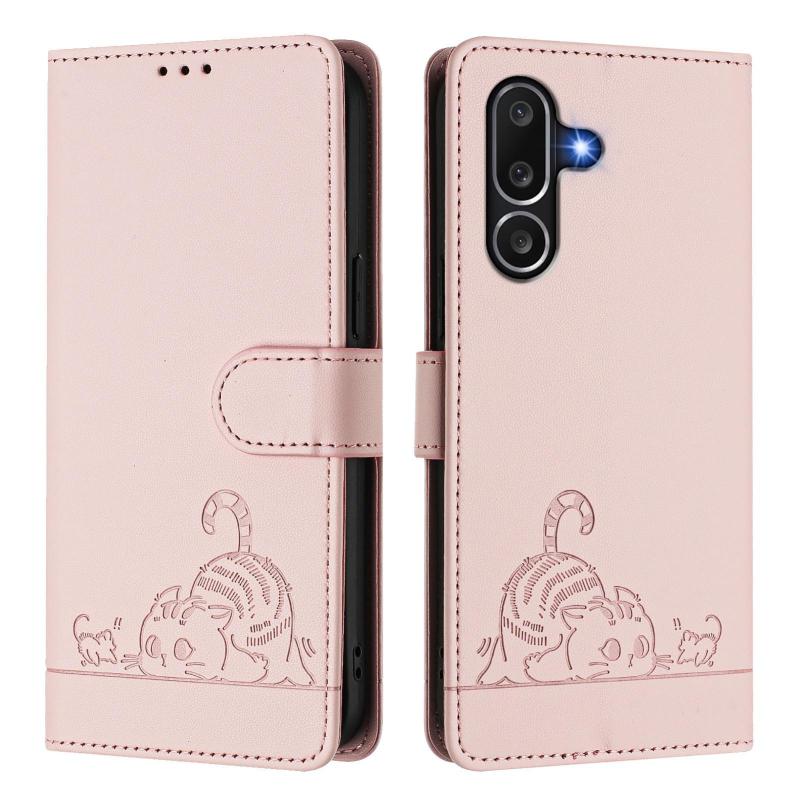For Samsung Galaxy M56 5G Cat Rat Embossed RFID Leather Phone Case with Lanyard(Pink)