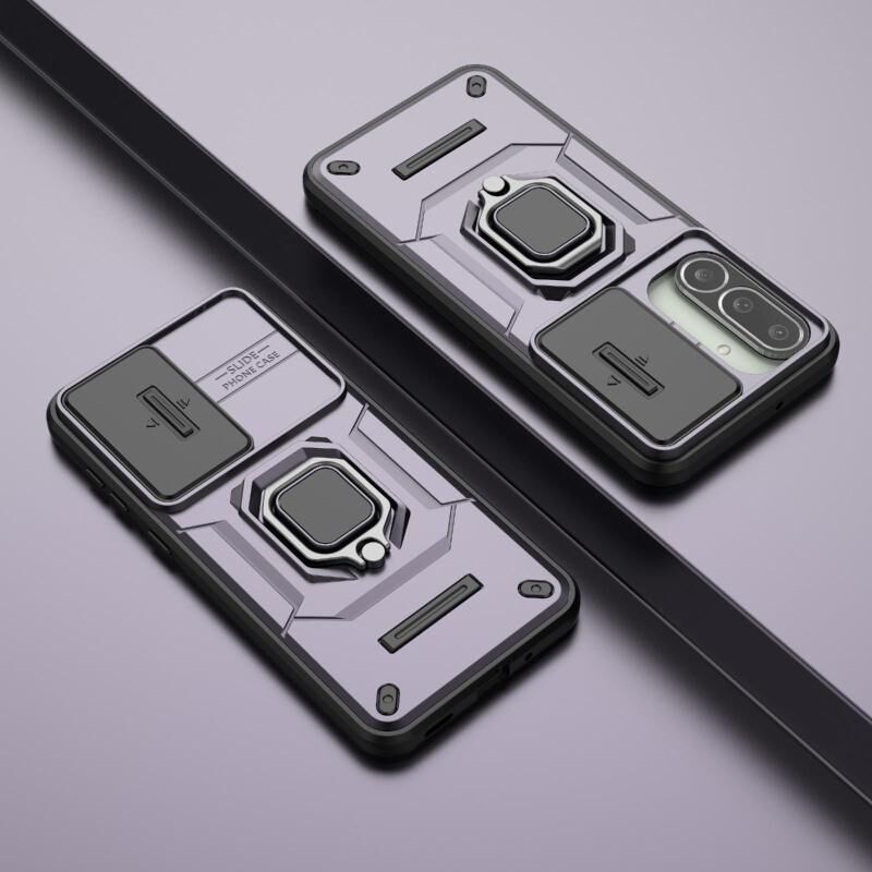 Θήκη κινητού τηλεφώνου για Samsung Galaxy M56 5G με ολισθαίνουσα προστασία κάμερας Camshield, κατασκευασμένη από TPU + PC, ανθεκτική σε κρούσεις με βάση στήριξης (Μωβ)