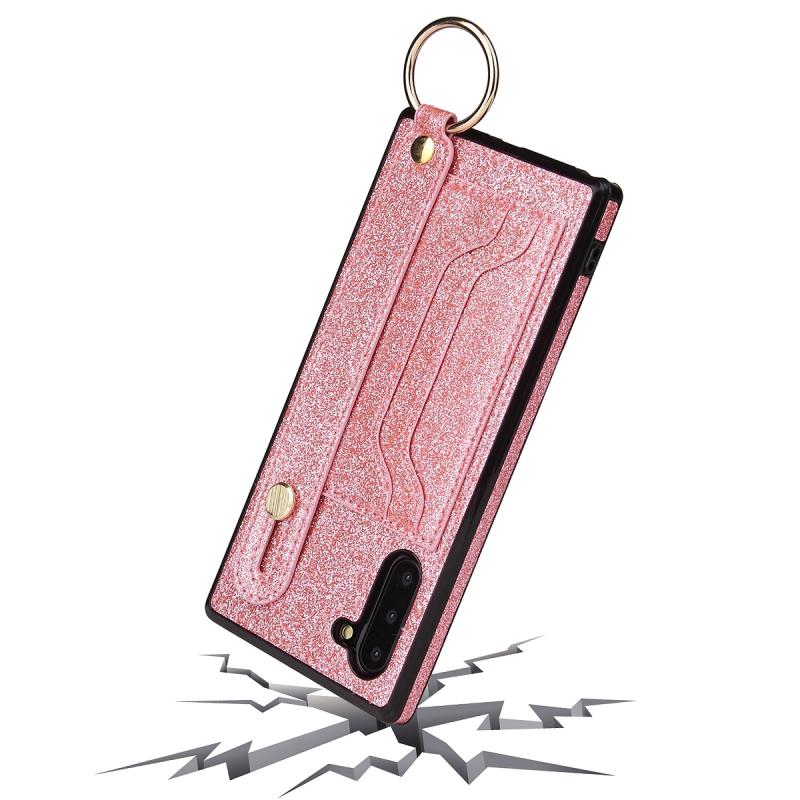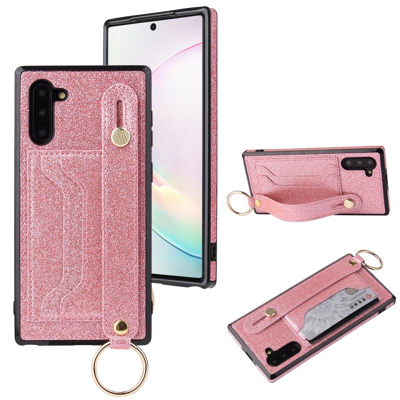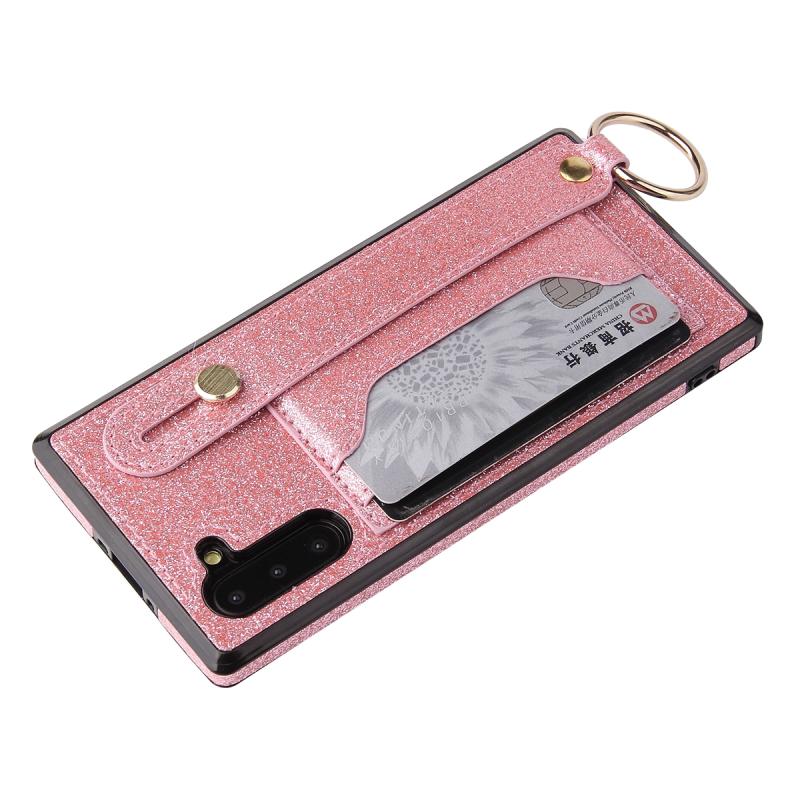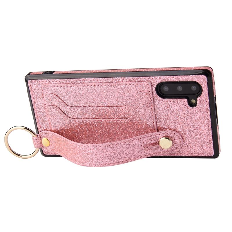 For Samsung Galaxy Note 10 Glitter Powder PU+TPU Shockproof Protective Case with Holder & Card Slots & Wrist Strap(Pink)