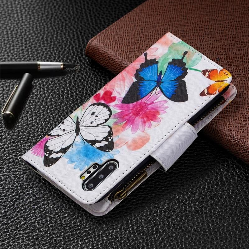 Θήκη Samsung Galaxy Note 10 Plus, Δερμάτινη οριζόντια με φερμουάρ, πολύχρωμο σχέδιο (Δύο πεταλούδες) με βάση για κάρτες και πορτοφόλι.