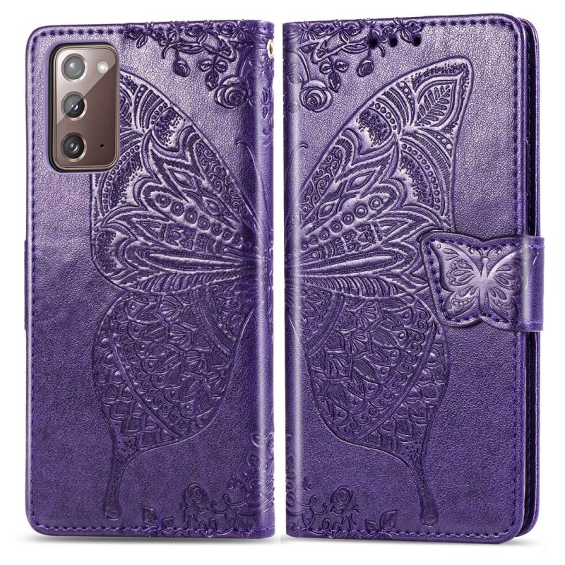 For Samsung Galaxy Note 20 Ultra Butterfly Love Flower Embossed Horizontal Flip Leather Case with Bracket / Card Slot / Wallet / Lanyard(Dark Purple)
