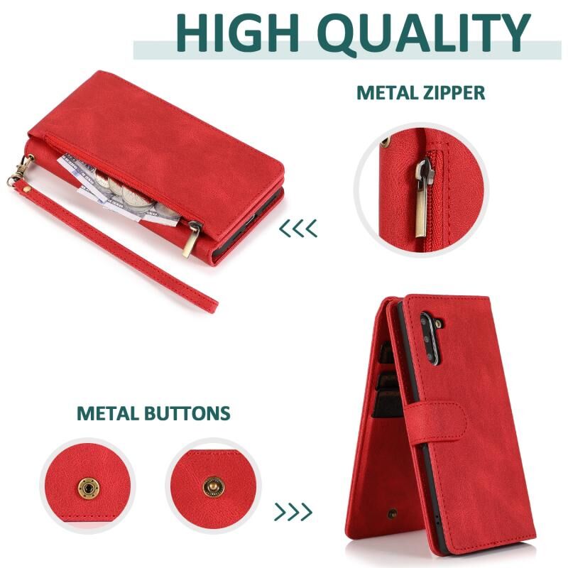 Για Samsung Galaxy Note10 Skin-feel Crazy Horse υφή φερμουάρ τσάντα πορτοφόλι οριζόντια Flip δερμάτινη θήκη με κάτοχο & υποδοχές για κάρτες & πορτοφόλι & κορδόνι (κόκκινο)