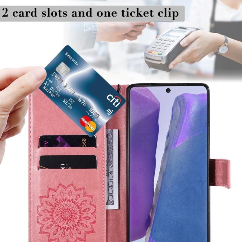 Θήκη Samsung Galaxy Note20 με ανάγλυφο σχέδιο ηλίανθου, οριζόντια, από δερματίνη PU με βάση, θήκες για κάρτες, πορτοφόλι και κορδόνι (Πράσινο)
