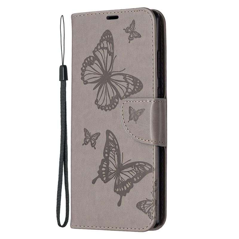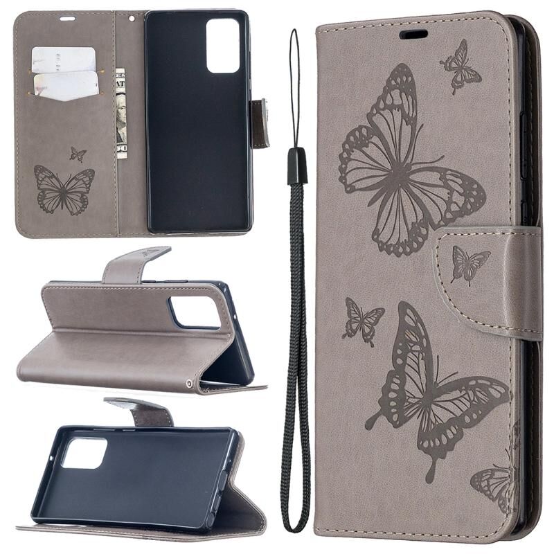Θήκη Samsung Galaxy Note20 με ανάγλυφο σχέδιο δύο πεταλούδων, οριζόντια, από δερματίνη PU με βάση, θήκη για κάρτες, πορτοφόλι και κορδόνι (Γκρι)