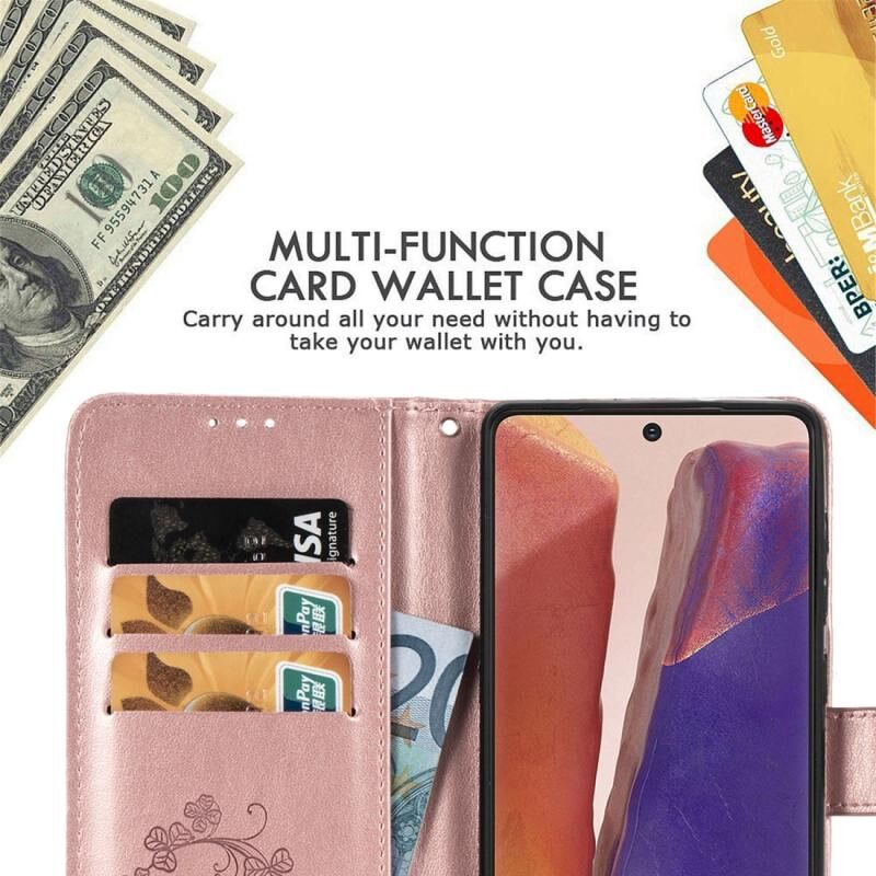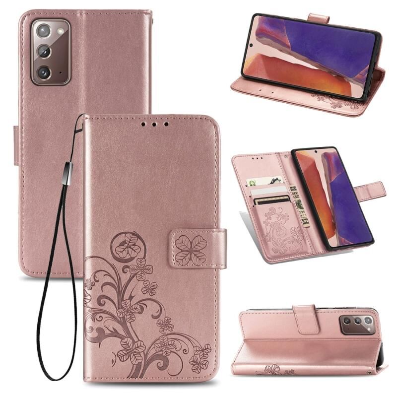 Θήκη δερμάτινη για Samsung Galaxy Note20 με σχέδιο τριφυλλιού, ανάγλυφο κούμπωμα, προστασία κινητού, λουρί, θήκη για κάρτες, πορτοφόλι και λειτουργία βάσης (Μωβ)