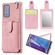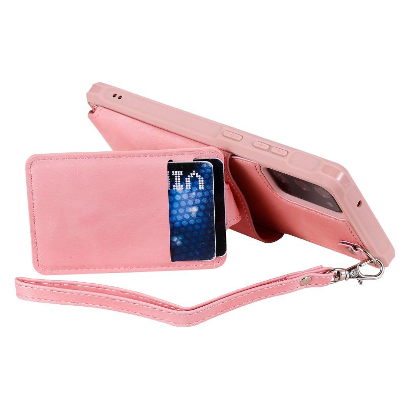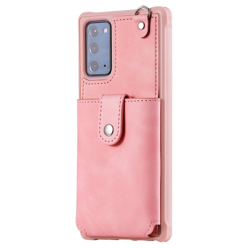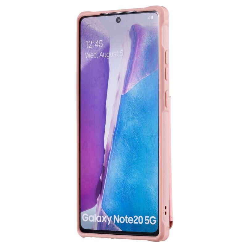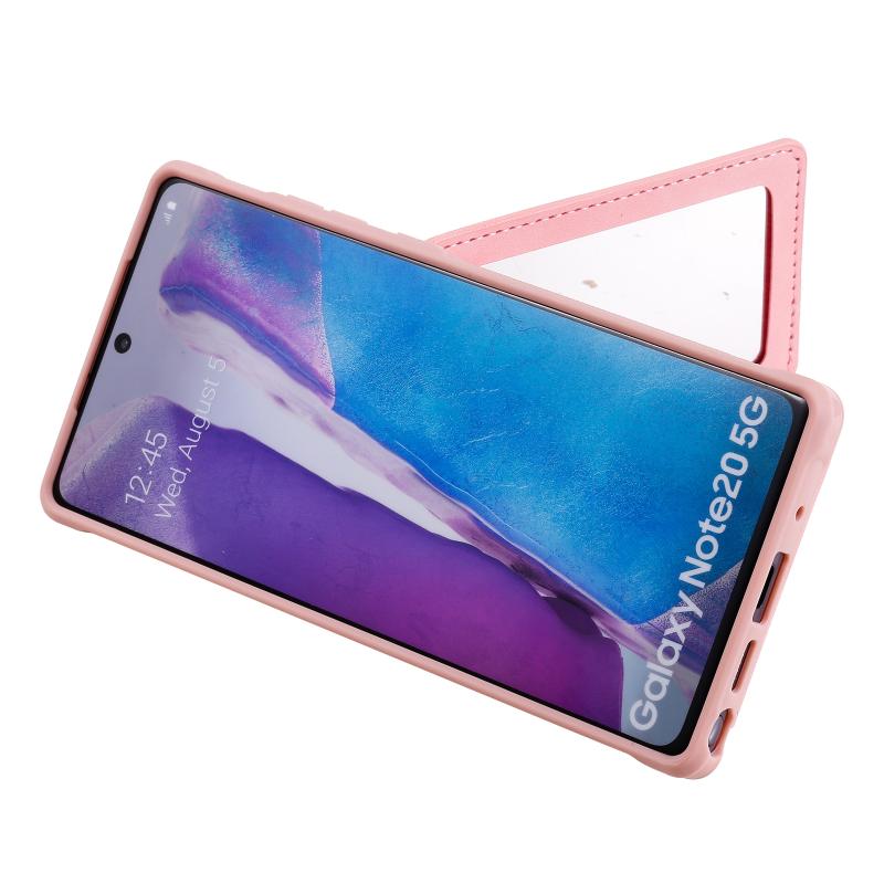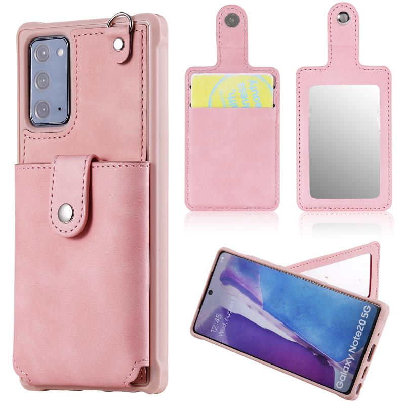 For Samsung Galaxy Note20 Shockproof Protective Case with Mirror & Card Slot & Short Lanyard(Pink)