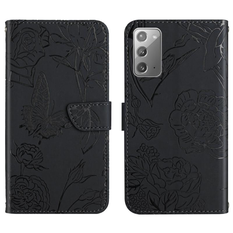 Θήκη τηλεφώνου Samsung Galaxy Note20 με ανάγλυφο δέρμα, αίσθηση δέρματος, σχέδιο πεταλούδας και παιώνιας (Κόκκινο)