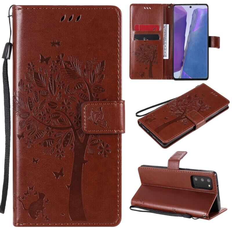 Θήκη Samsung Galaxy Note20 με σχέδιο δέντρου & γάτας, εκτύπωση με θερμοτύπηση, οριζόντια, από δερματίνη PU με βάση στήριξης, θήκες για κάρτες, πορτοφόλι & λουρί (Καφέ)