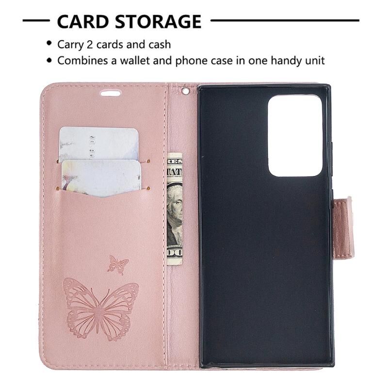Θήκη Samsung Galaxy Note20 Ultra με ανάγλυφο σχέδιο δύο πεταλούδων, οριζόντια, από δερματίνη PU με βάση στήριξης, θήκη για κάρτες, πορτοφόλι και λουρί (Κόκκινο Ρόδι)