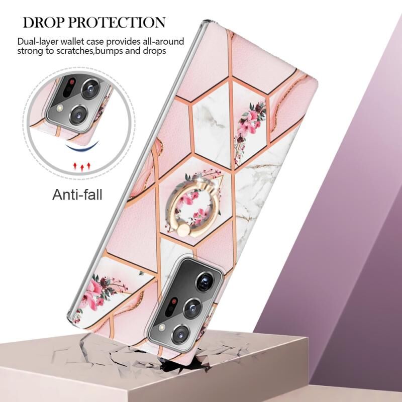 Θήκη για Samsung Galaxy Note20 Ultra με σχέδιο μαρμάρου και λουλουδιών σε στυλ patchwork, με δακτύλιο στήριξης (Ροζ Λουλούδι)
