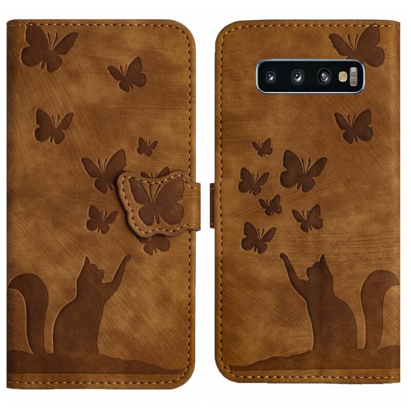 Θήκη τηλεφώνου Samsung Galaxy S10+ με ανάγλυφο σχέδιο πεταλούδας και γάτας, δερμάτινη, τύπου flip (Μωβ)