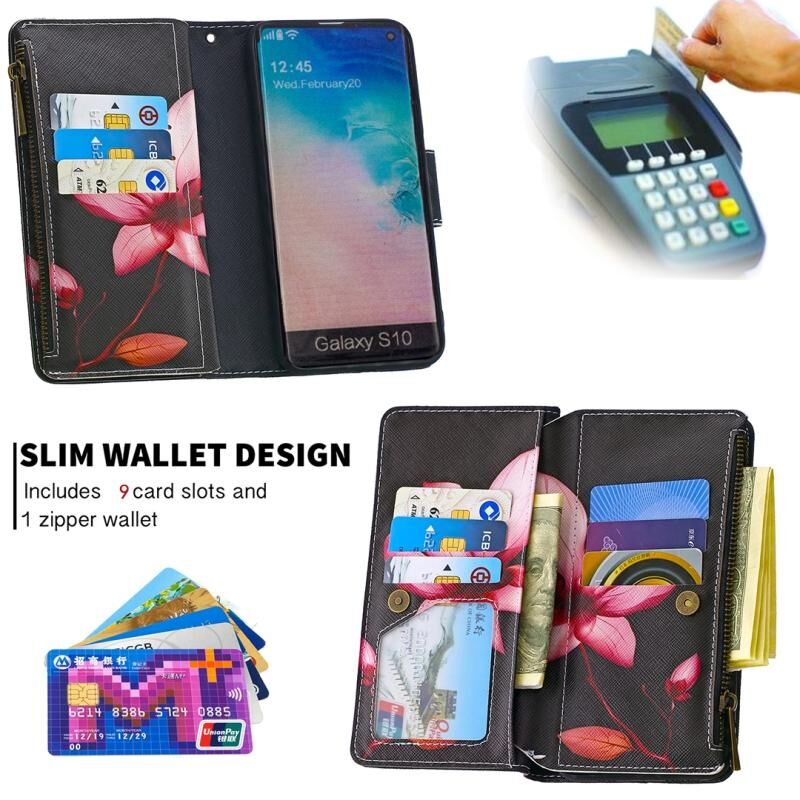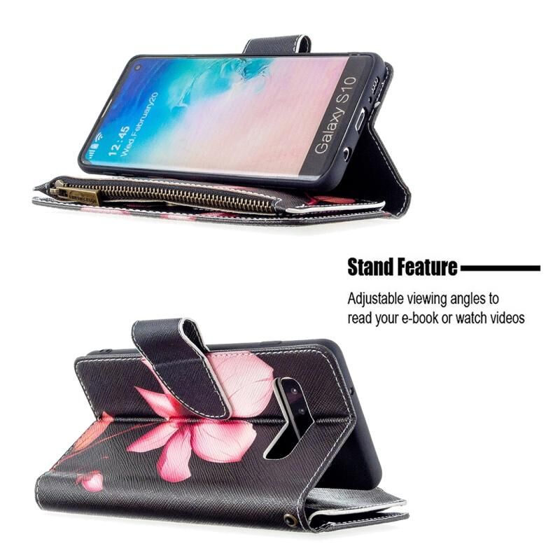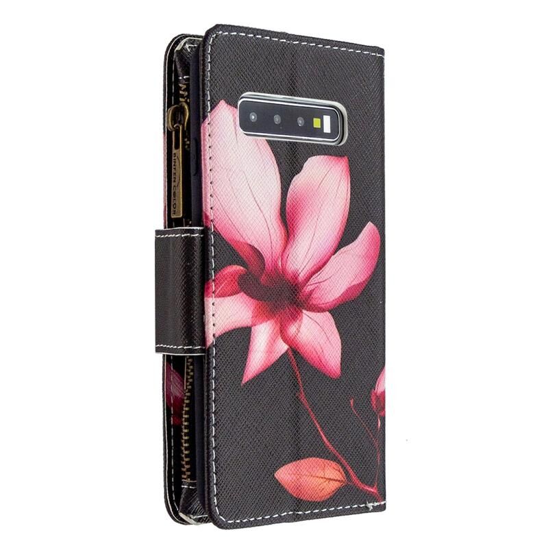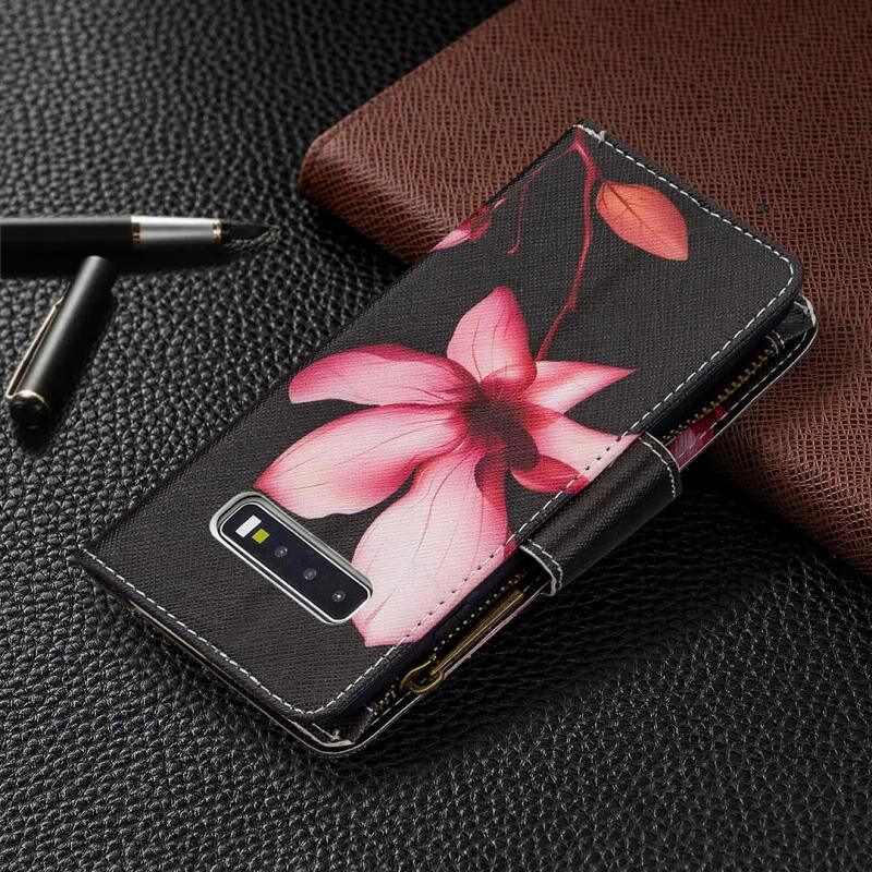 Θήκη Samsung Galaxy S10 Δερμάτινη Οριζόντια με Φερμουάρ, Πολύχρωμο Σχέδιο, με Θήκη & Θήκες Καρτών & Πορτοφόλι (Λωτός)