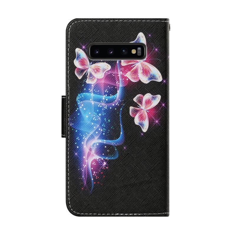 Θήκη Samsung Galaxy S10 με σχέδιο πολύχρωμης ζωγραφικής, οριζόντια, από δερματίνη PU με βάση στήριξης & θήκες για κάρτες & πορτοφόλι & κορδόνι (Τρεις φθορίζουσες πεταλούδες)