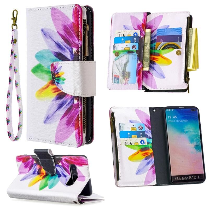 Θήκη δέρματος οριζόντιας αναδίπλωσης με φερμουάρ για Samsung Galaxy S10 Plus με έγχρωμο σχέδιο, θήκη και υποδοχές καρτών & πορτοφόλι (Ηλίανθος)