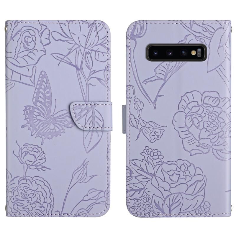 Θήκη τηλεφώνου Samsung Galaxy S10+ με ανάγλυφο δέρμα, αίσθηση δέρματος, σχέδιο πεταλούδας και παιώνιας (Μωβ)
