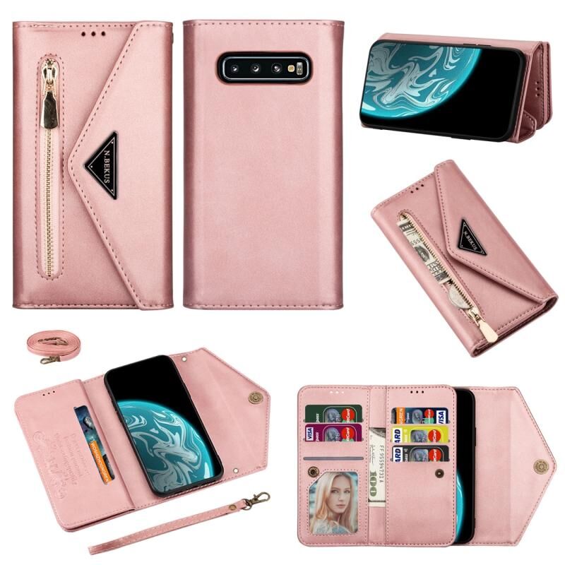 Θήκη Samsung Galaxy S10, Δερμάτινη Οριζόντια με Φερμουάρ, Αίσθηση Δέρματος, με Θήκη, Θήκες Καρτών, Φωτογραφική Κορνίζα, Λουρί & Μακρύ Σχοινί (Ροζ χρυσός)