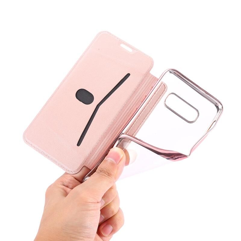 Θήκη δέρματος οριζόντιας αναδίπλωσης PU + TPU με επιμετάλλωση μπρούτζου για Samsung Galaxy S10e με βάση & υποδοχή κάρτας (Μαύρο)