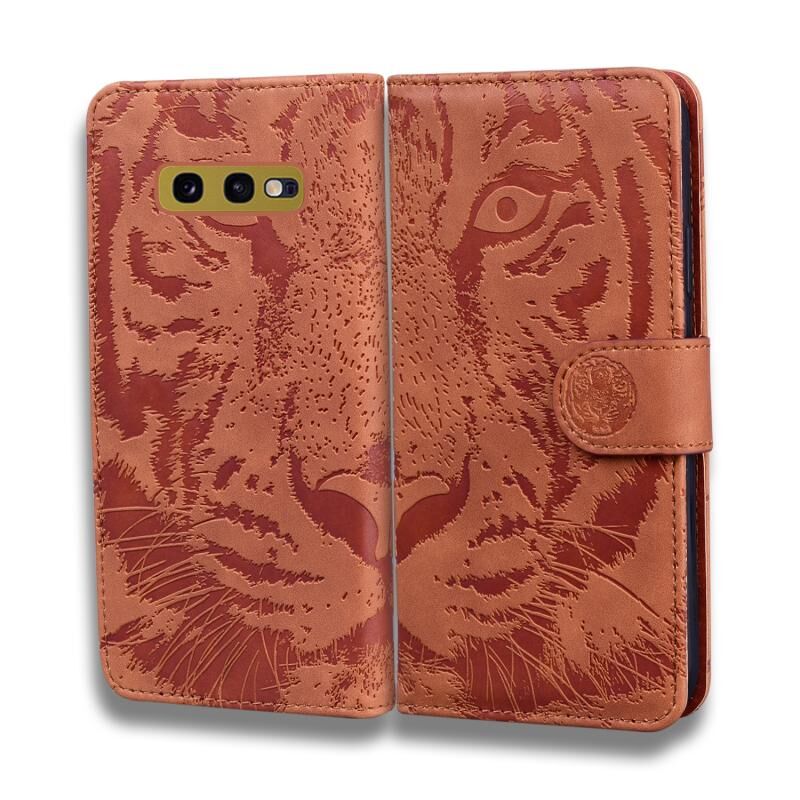 Θήκη δέρματος οριζόντιας αναδίπλωσης με ανάγλυφο μοτίβο τίγρης για Samsung Galaxy S10e με βάση & υποδοχές καρτών & πορτοφόλι (Καφέ)