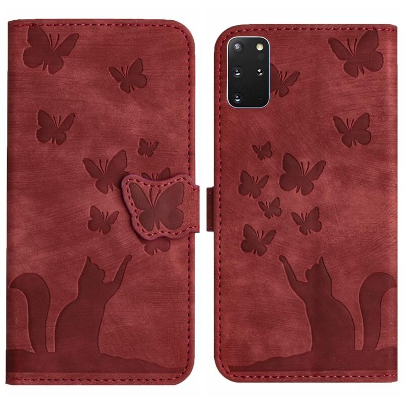 Θήκη τηλεφώνου Samsung Galaxy S20+ με ανάγλυφο σχέδιο πεταλούδας και γάτας, δερμάτινη, τύπου flip (Κόκκινο)