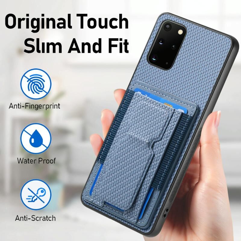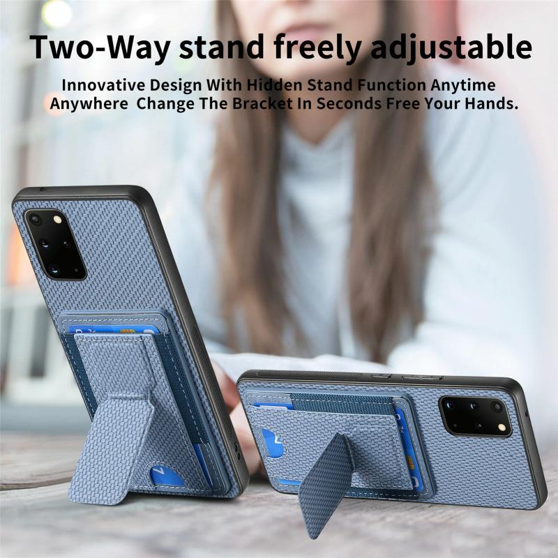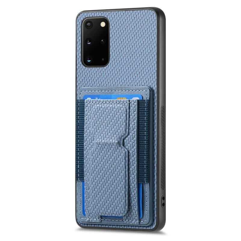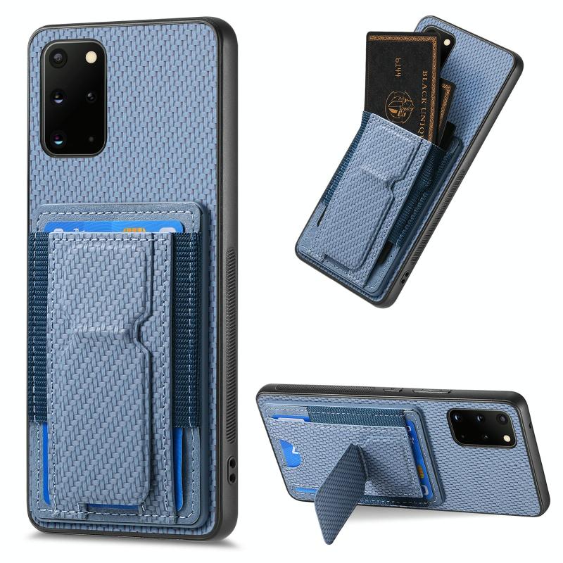 For Samsung Galaxy S20+ Carbon Fiber Fold Stand Elastic Card Bag Phone Case(Blue)