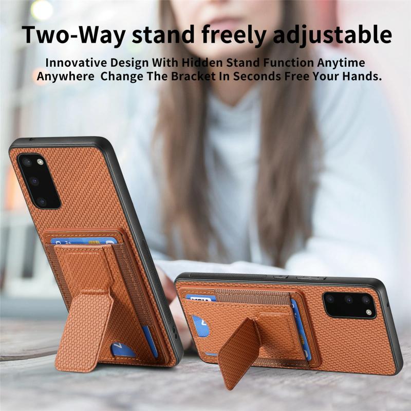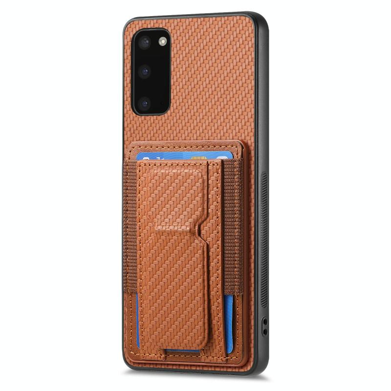 For Samsung Galaxy S20 Carbon Fiber Fold Stand Elastic Card Bag Phone Case(Brown)