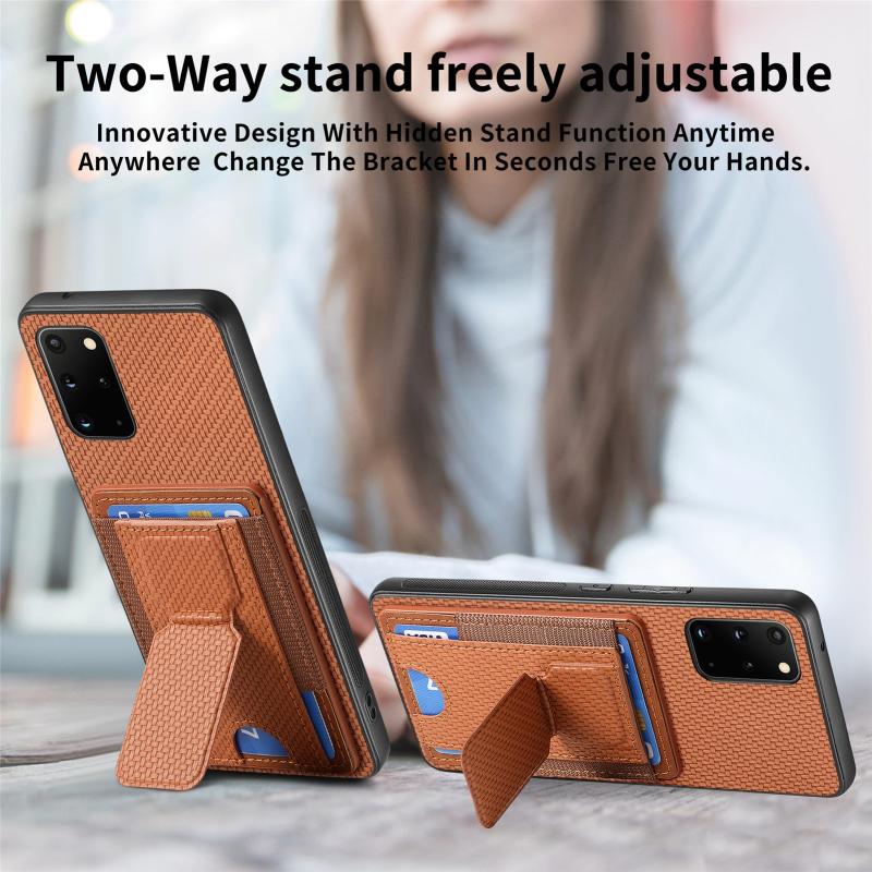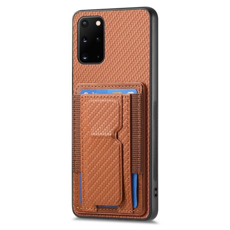 For Samsung Galaxy S20+ Carbon Fiber Fold Stand Elastic Card Bag Phone Case(Brown)