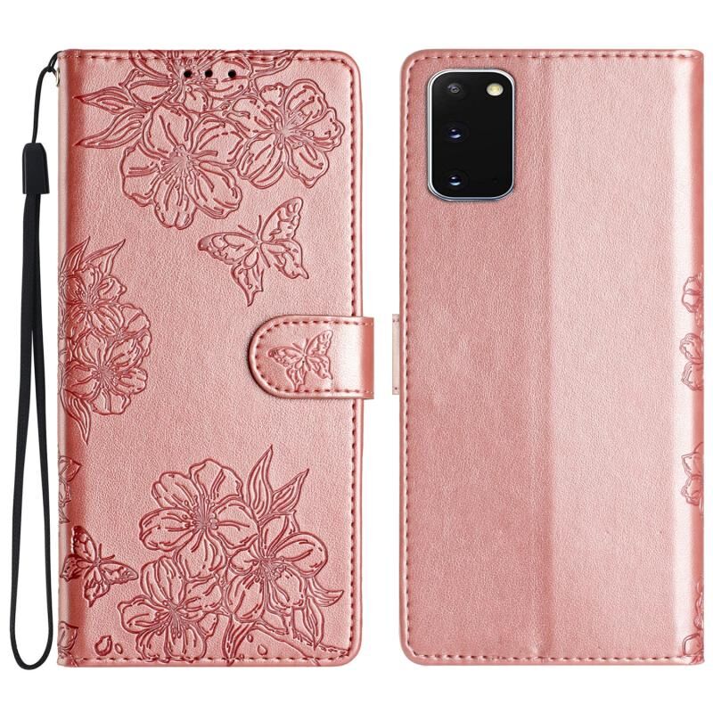 Θήκη κινητού τηλεφώνου Samsung Galaxy S20 Cherry Blossom Butterfly με ανάγλυφο PU υλικό αίσθησης δέρματος (Κόκκινο)