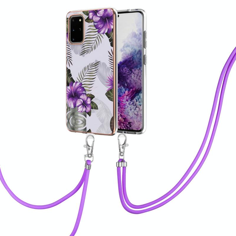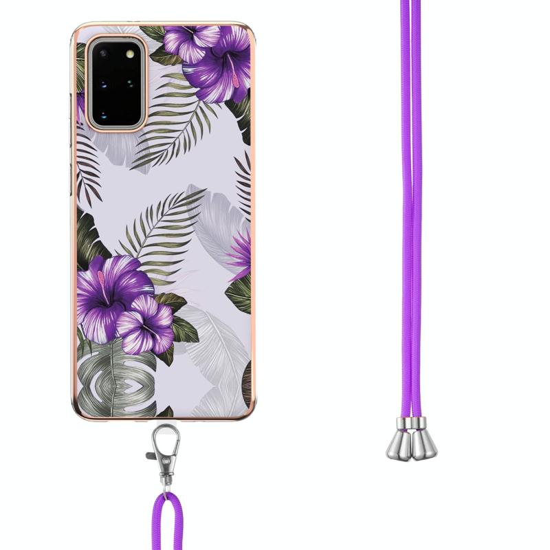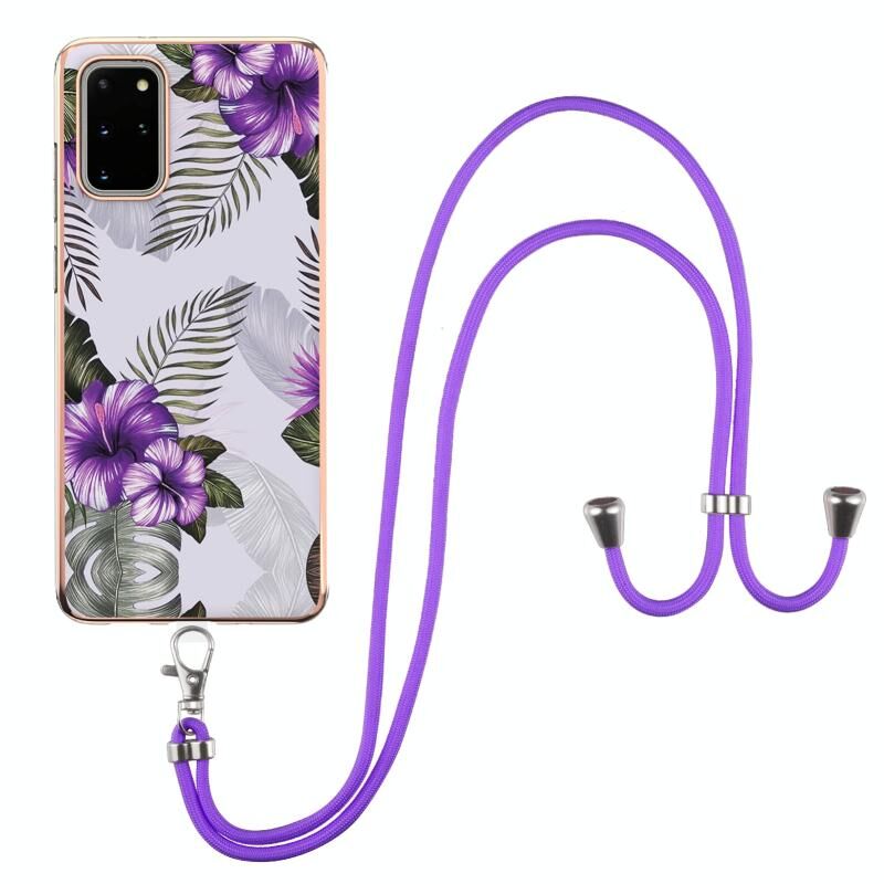 For Samsung Galaxy S20+ Electroplating Pattern IMD TPU Shockproof Case with Neck Lanyard(Purple Flower)
