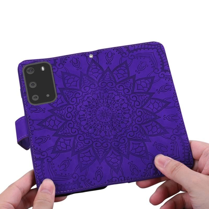 Θήκη Samsung Galaxy S20+ με ανάγλυφο σχέδιο ηλιοτρόπιου, οριζόντια, από δερματίνη PU με βάση στήριξης, θήκες για κάρτες, πορτοφόλι & λουρί (Μωβ)