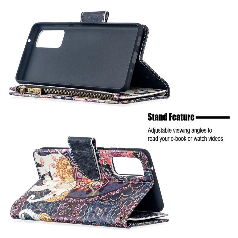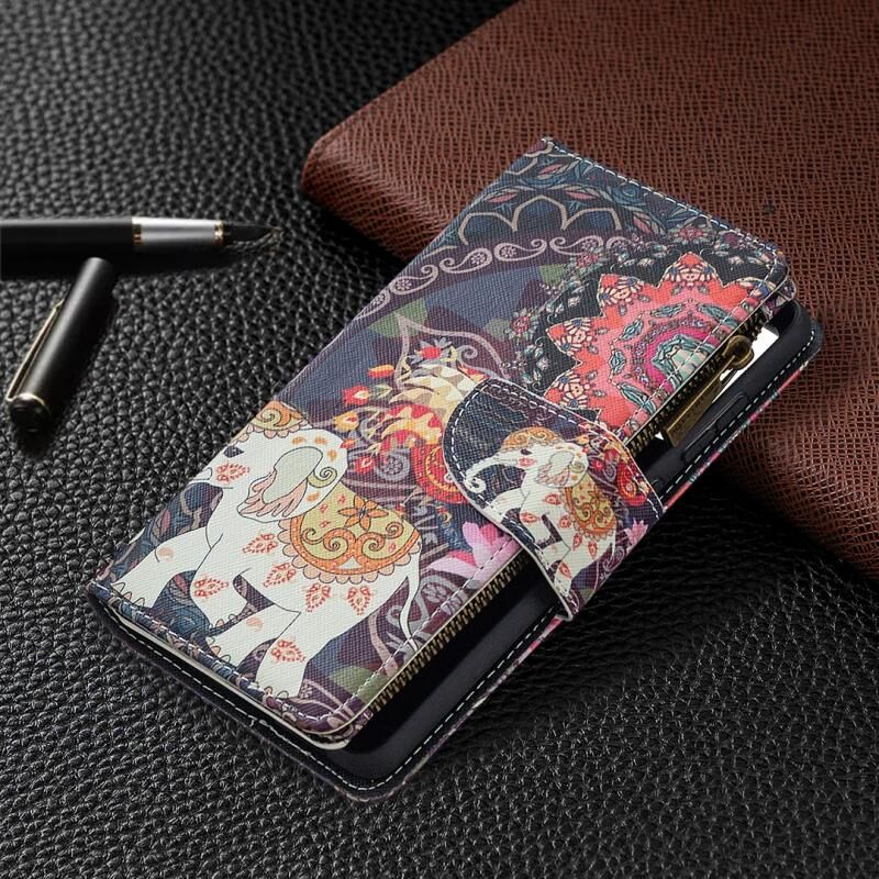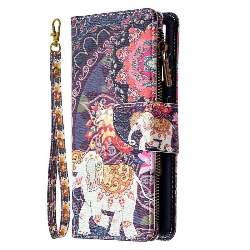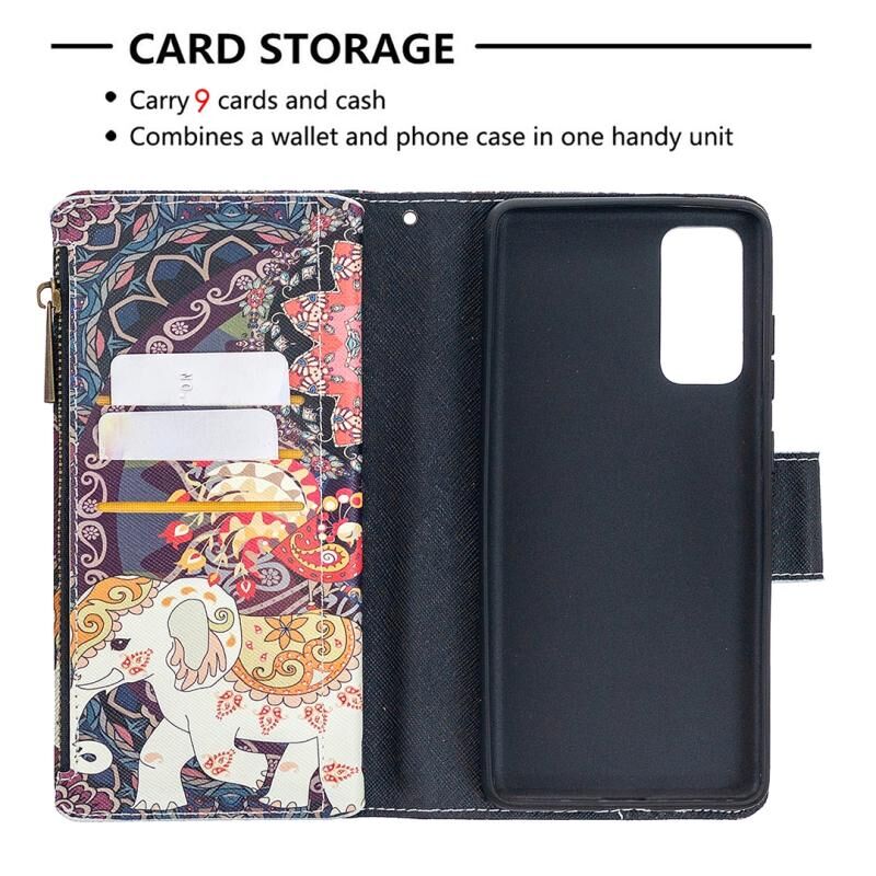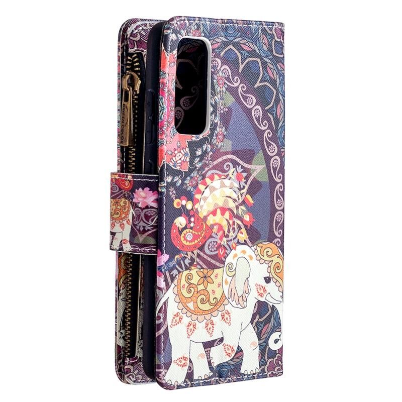 Θήκη δέρματος οριζόντιας αναδίπλωσης με φερμουάρ και σχέδια πολύχρωμης ζωγραφικής για Samsung Galaxy S20 FE 5G / S20 Lite με βάση για κάρτες & θήκη πορτοφολιού (Λουλούδια & Ελέφαντες)