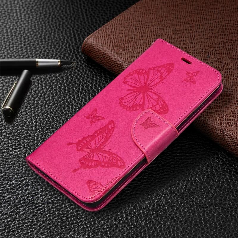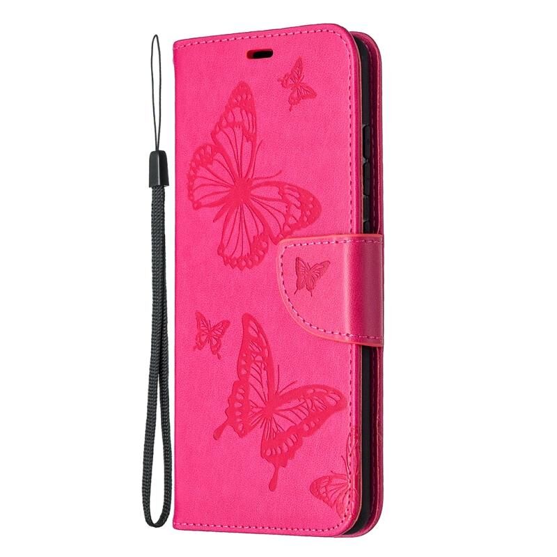 Θήκη Samsung Galaxy S20 FE 5G / S20 Lite με ανάγλυφο σχέδιο δύο πεταλούδων, οριζόντια, από δερματίνη PU με βάση στήριξης, θήκη για κάρτες, πορτοφόλι & λουρί (Κόκκινο Ρόδι)