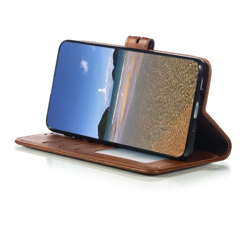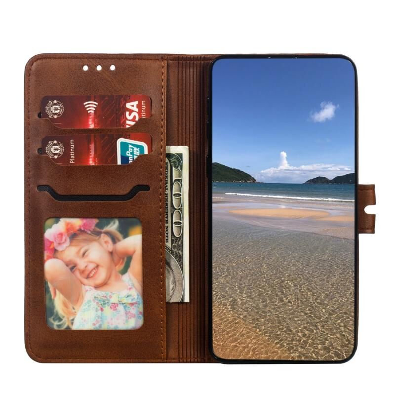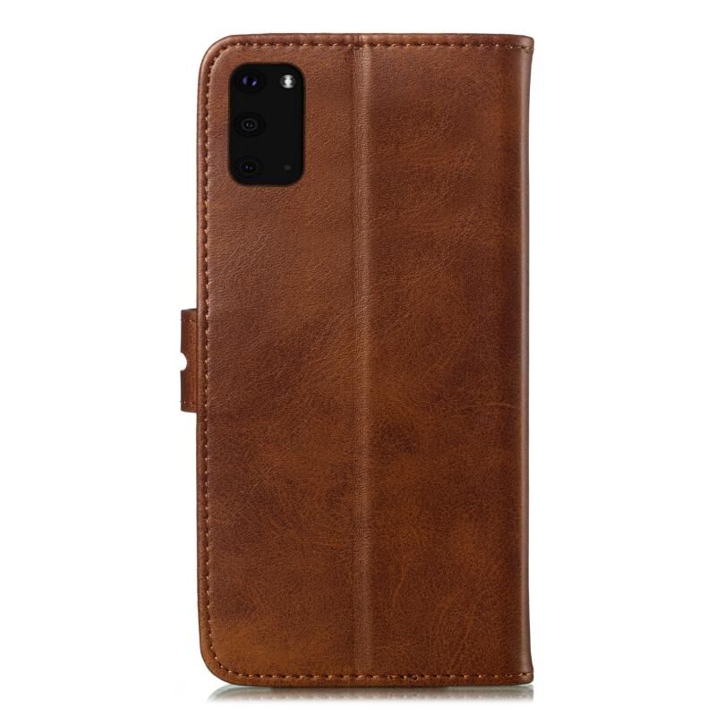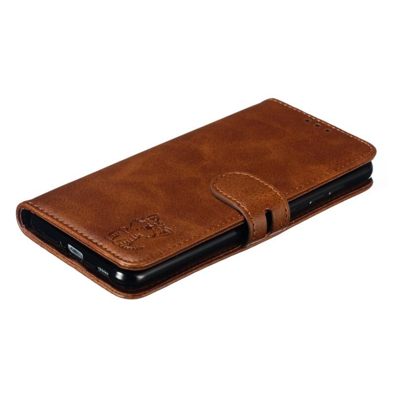 Θήκη Samsung Galaxy S20 FE, Δερμάτινη Οριζόντια με ανάγλυφο σχέδιο χαρούμενης γάτας, με βάση & Θήκες για Κάρτες & Πορτοφόλι (Καφέ)