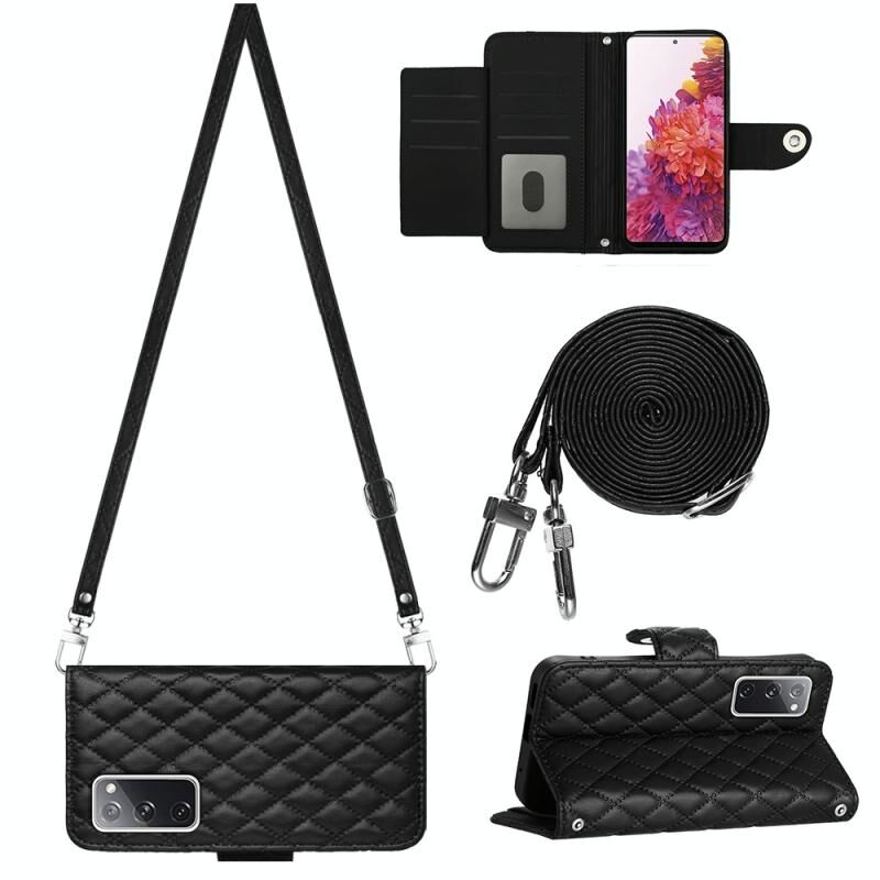 Για Samsung Galaxy S20 FE Ρομβική υφή Flip δερμάτινη θήκη τηλεφώνου με μακρύ κορδόνι (μαύρο)