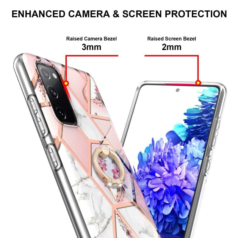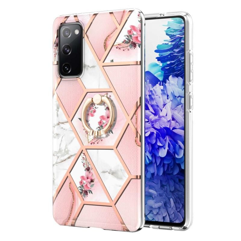 For Samsung Galaxy S20 FE / S20 Lite Electroplating Splicing Marble Flower Pattern TPU Shockproof Case with Rhinestone Ring Holder(Pink Flower)