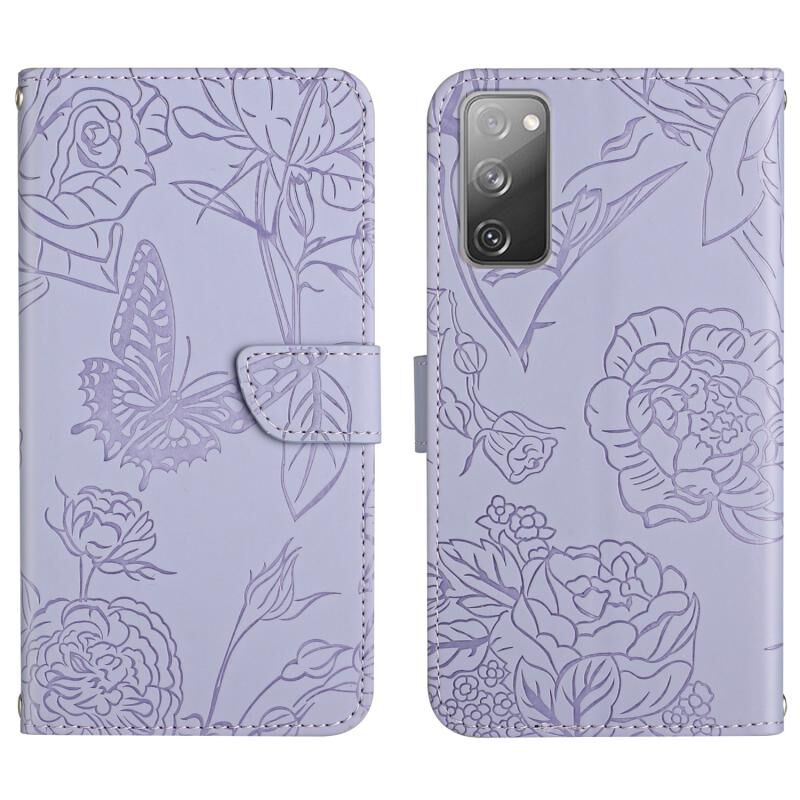 Θήκη τηλεφώνου Samsung Galaxy S20 FE με ανάγλυφο δέρμα, αίσθηση δέρματος, σχέδιο πεταλούδας και παιώνιας (Κόκκινο)