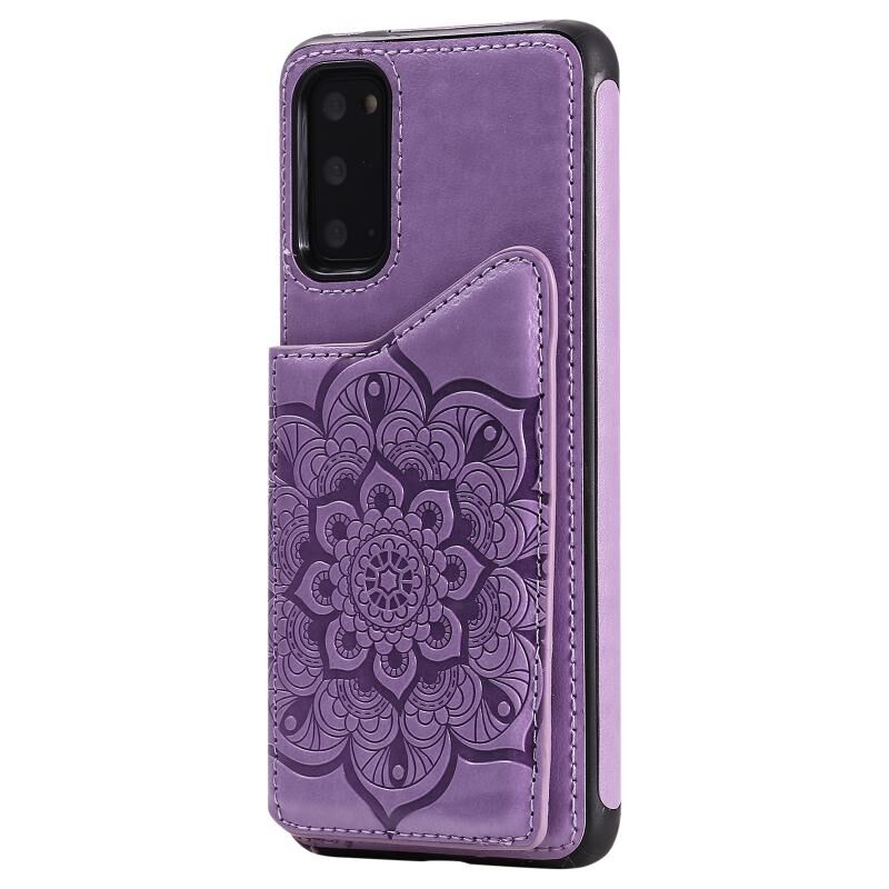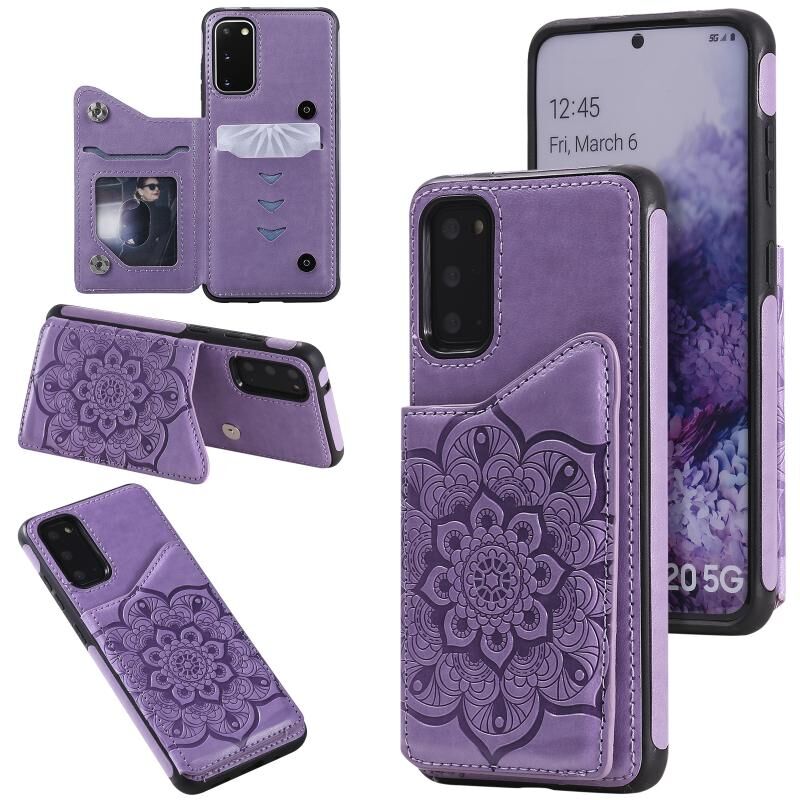 Για Samsung Galaxy S20 λουλούδι ανάγλυφο μοτίβο Shockproof προστατευτική θήκη με θήκη & υποδοχές για κάρτες & πλαίσιο φωτογραφιών (Μωβ)