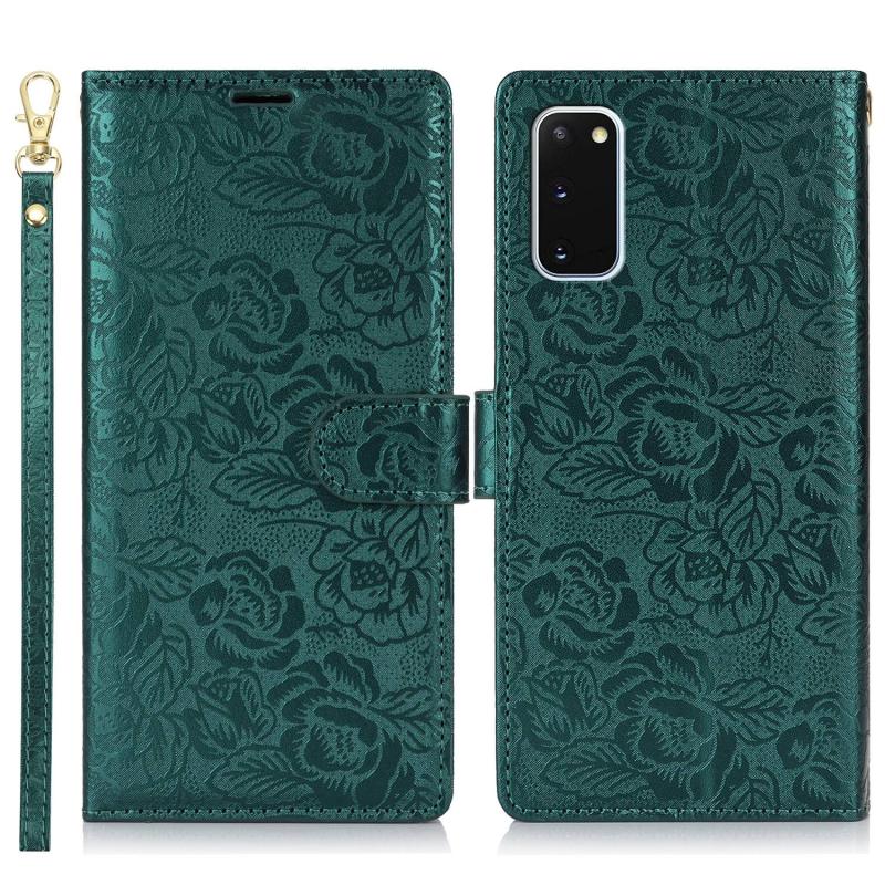 For Samsung Galaxy S20 Peony Flowers Imprint Leather Phone Case(Green)