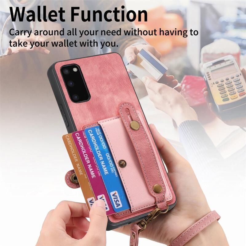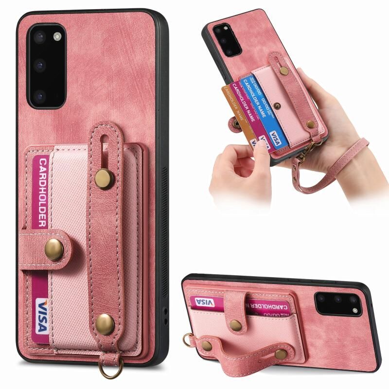 Για Samsung Galaxy S20 Ρετρό σταυρό Wristband πορτοφόλι δέρμα πίσω υπόθεση τηλεφώνου (ρόζ)
