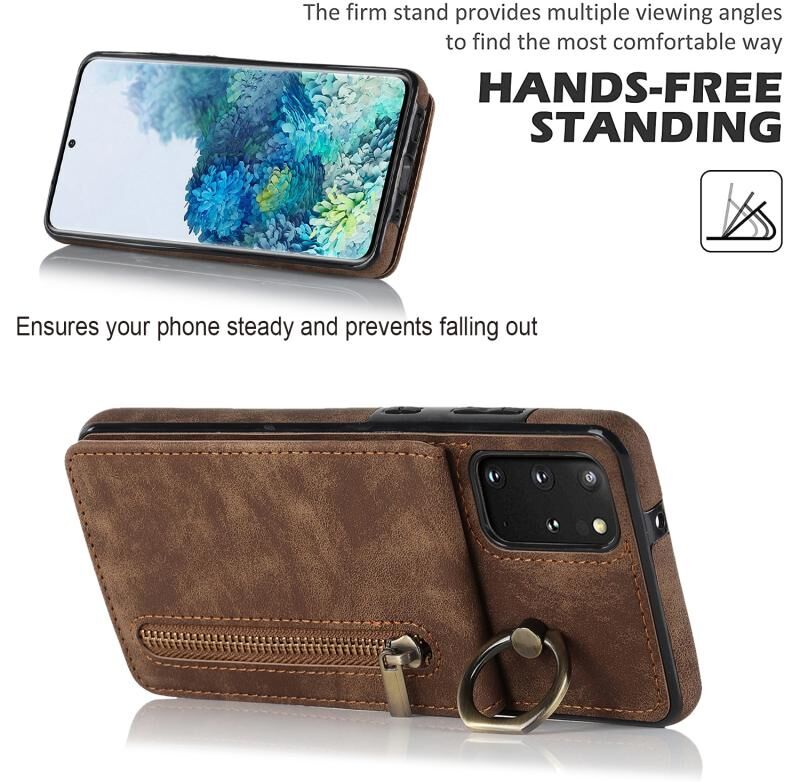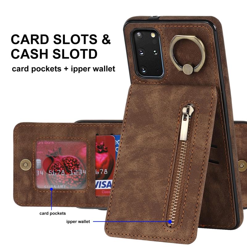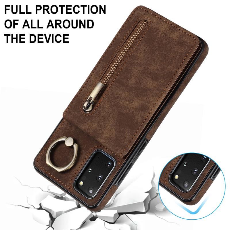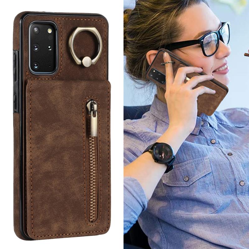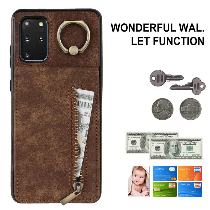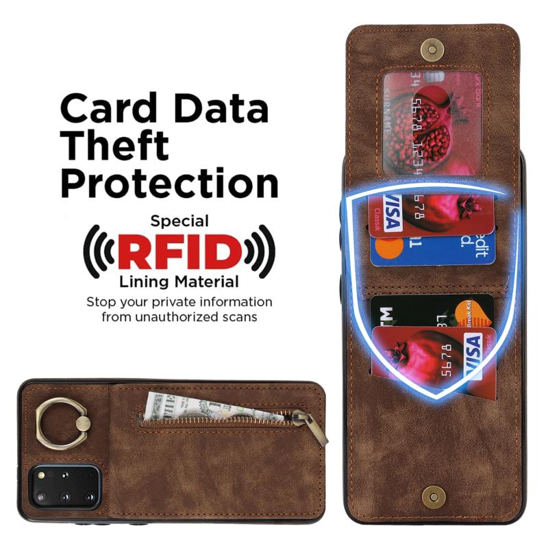 Θήκη κινητού τηλεφώνου Samsung Galaxy S20+ με ρετρό δακτύλιο και θήκη καρτών RFID με φερμουάρ (Καφέ)