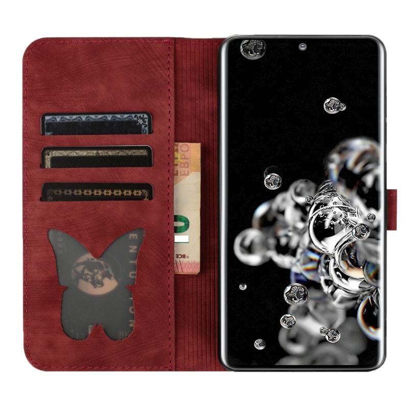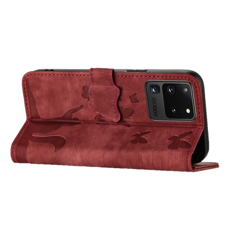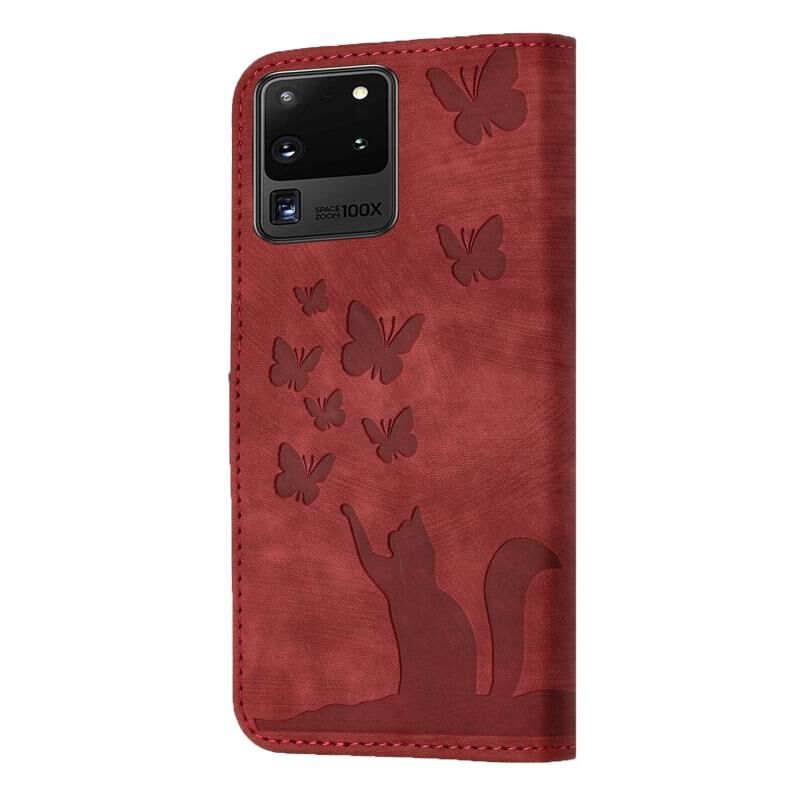 Θήκη τηλεφώνου Samsung Galaxy S20 Ultra με ανάγλυφο σχέδιο πεταλούδας και γάτας, δερμάτινη, τύπου flip (Κόκκινο)