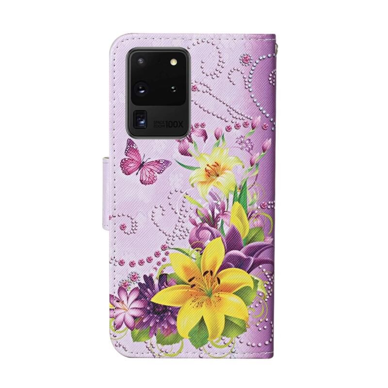Θήκη δέρματος οριζόντιας αναδίπλωσης με σχέδιο έγχρωμης ζωγραφικής για Samsung Galaxy S20 Ultra με βάση στήριξης & υποδοχές καρτών & πορτοφόλι & κορδόνι (Κίτρινο Πεταλούδα Λουλούδι)