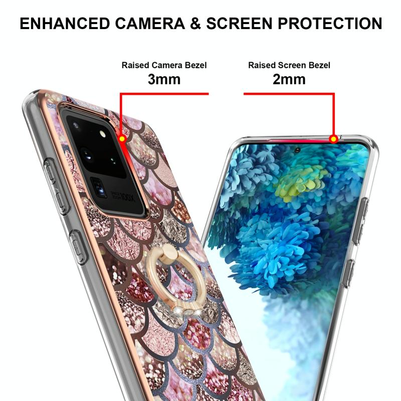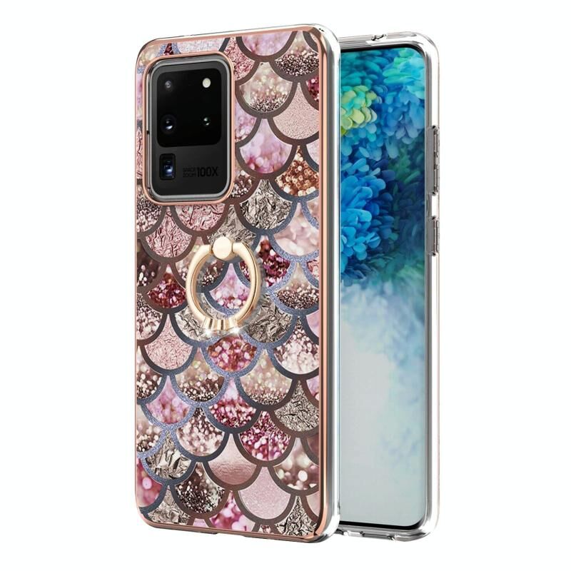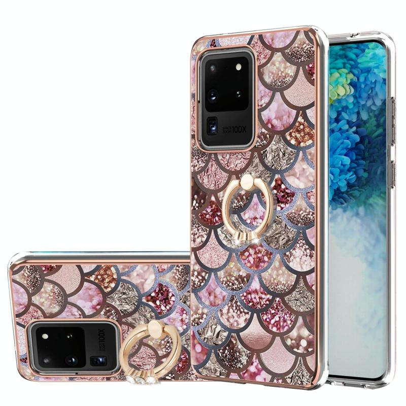 For Samsung Galaxy S20 Ultra Electroplating Pattern IMD TPU Shockproof Case with Rhinestone Ring Holder(Pink Scales)