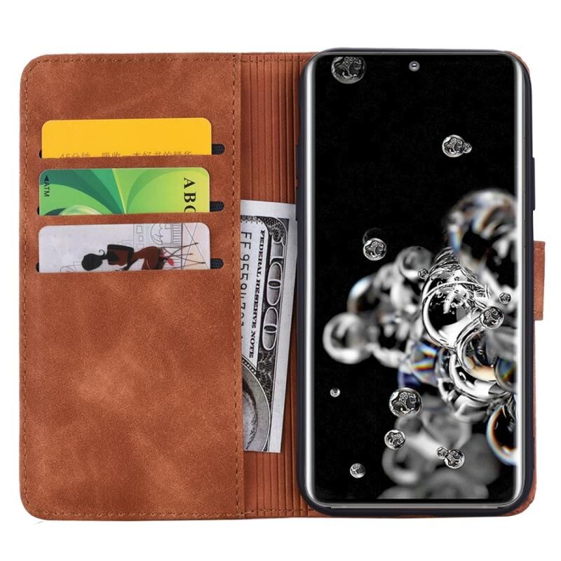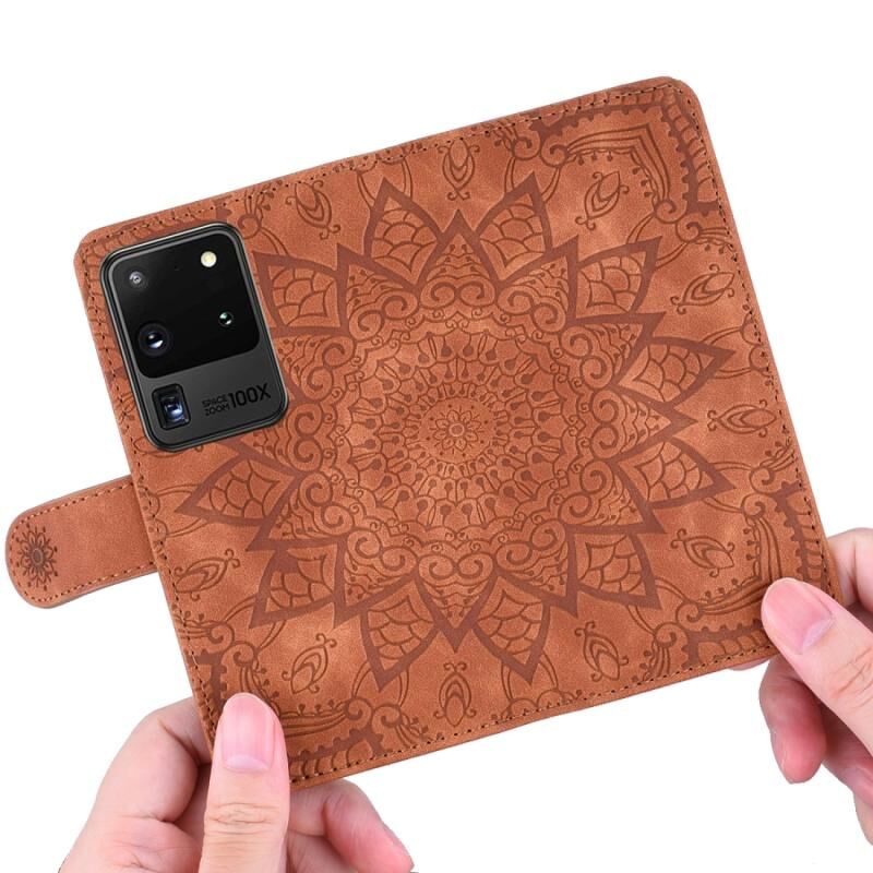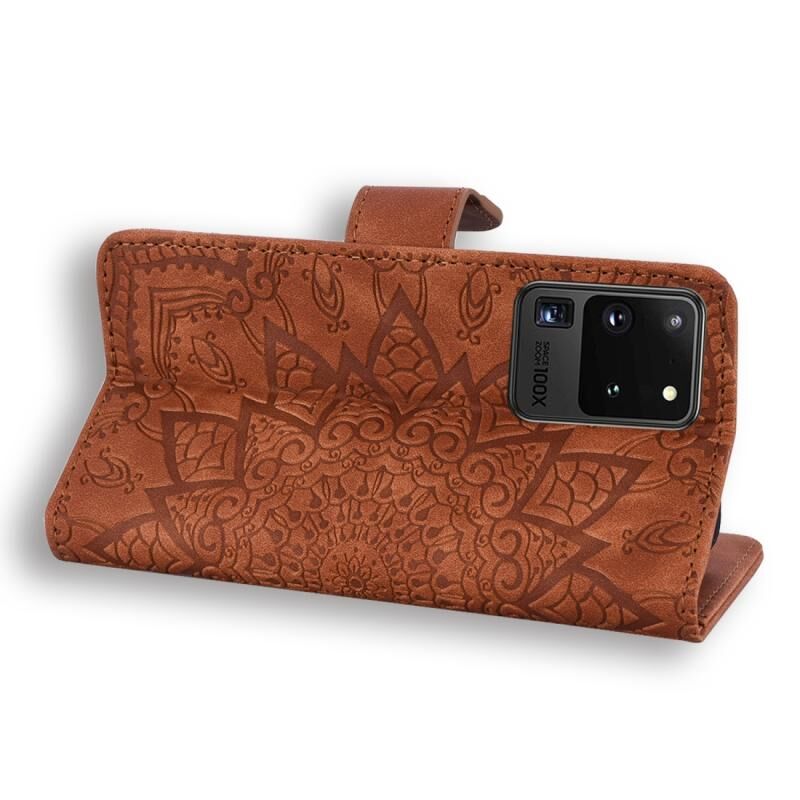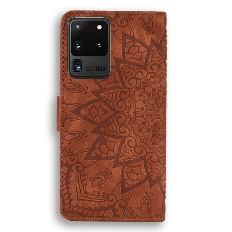 Θήκη Samsung Galaxy S20 Ultra με ανάγλυφο σχέδιο ηλίανθου, οριζόντια, από δερματίνη PU με βάση στήριξης, θήκες για κάρτες, πορτοφόλι & λουρί (Καφέ)